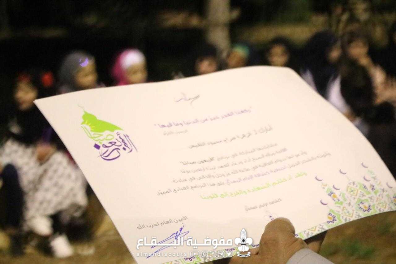أقام فوج السيدة خولة/ بوداي/ القطاع الغربي، إفطار للكشفيات على حب أمير المؤمنين، وقد سبقه درس عن ليلة القدر واستشهاد الامام علي عليه السلام وختم بتوزيع افادات المشاركة على اللواتي شاركن في مشروع الأربعون صباحاً في العام الماضي كل ذلك في مدينة السيد عباس الشبابية الكشفية...