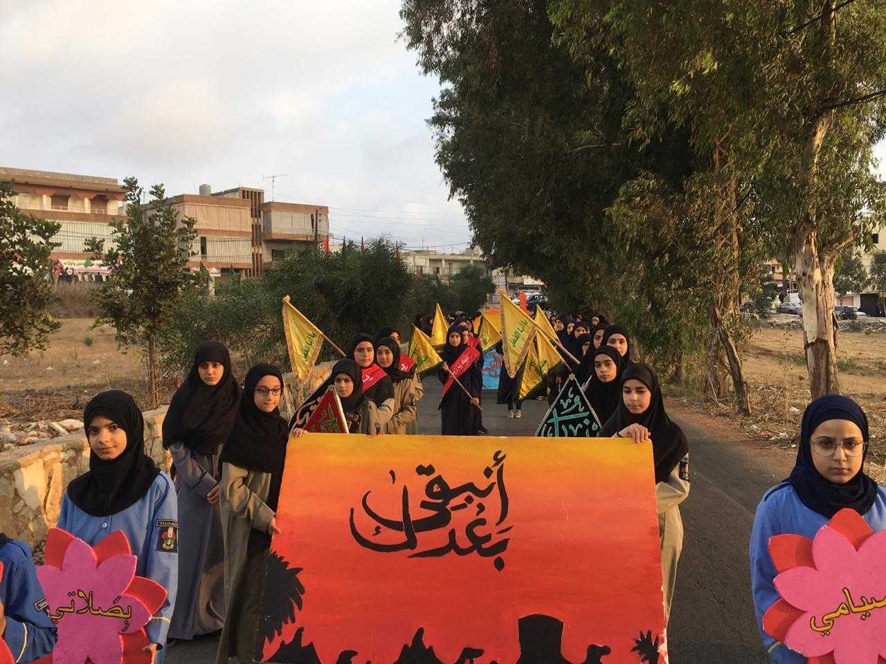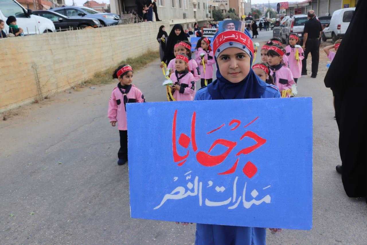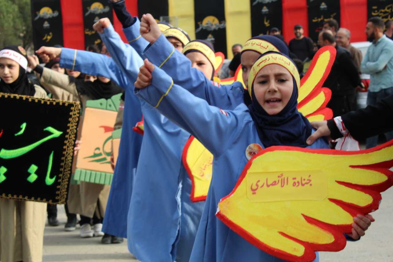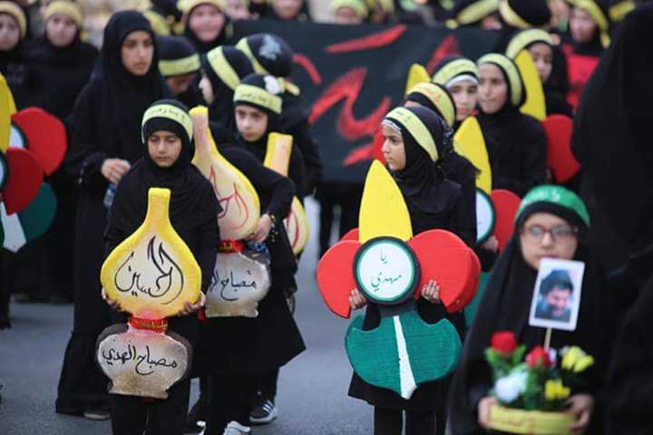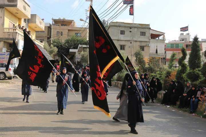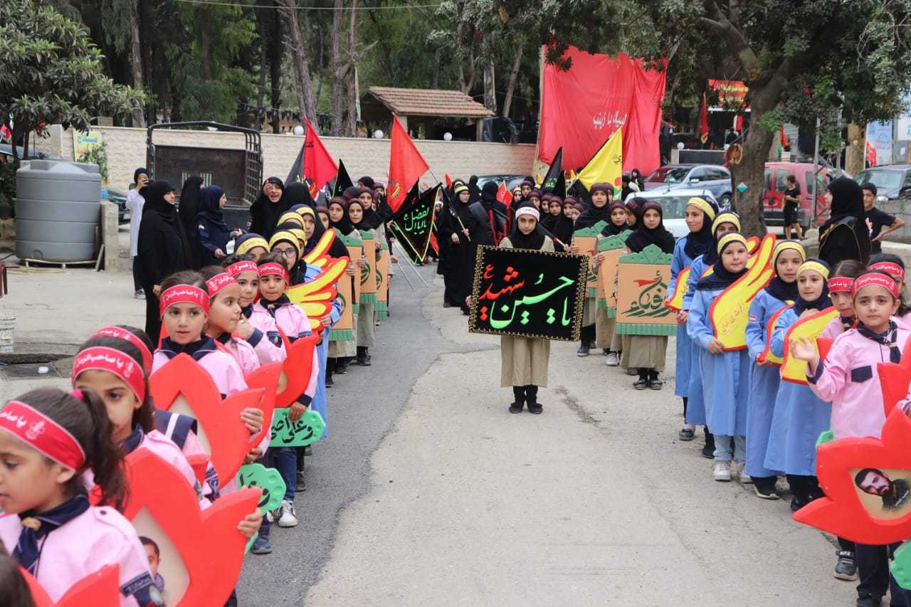 فسارت في اغلب القرى مسيرات التلبية والنصرة الحسينية، وفيها رسم الاطفال المشاركون باكفانهم وعصباتهم الوان عاشوراء البطولة والفداء،