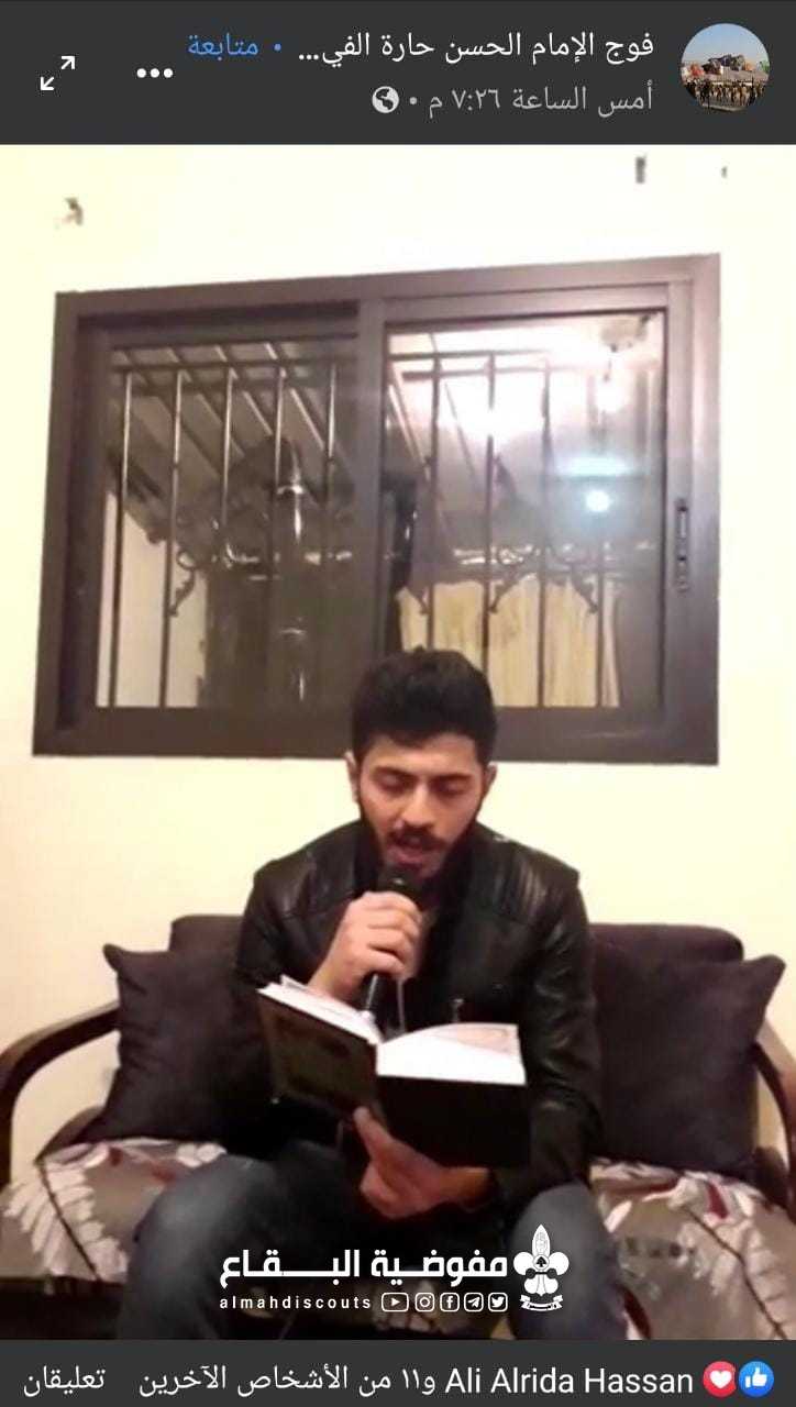 للابداع عنوان ومن منزل عميد الفوج ولاستمرار العمل الكشفي فقد نفذ فوج الامام الحسن عليه السلام حارة الفيكاني /القطاع الشرقي نشاط دعاء التوسل فيديو عبر صفحة الفوج على الفايس بوك ، كما ودعا جميع القادة والعناصر لاستماعه مباشرة على الصفحة.
