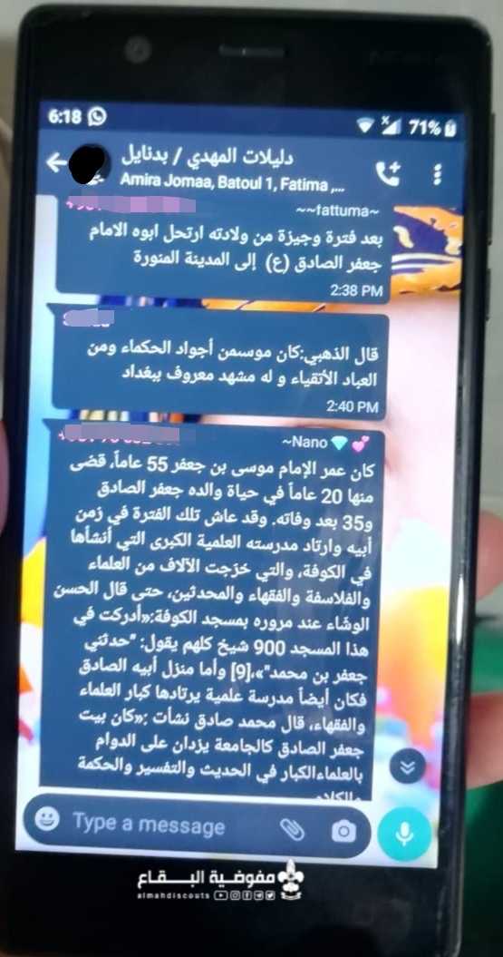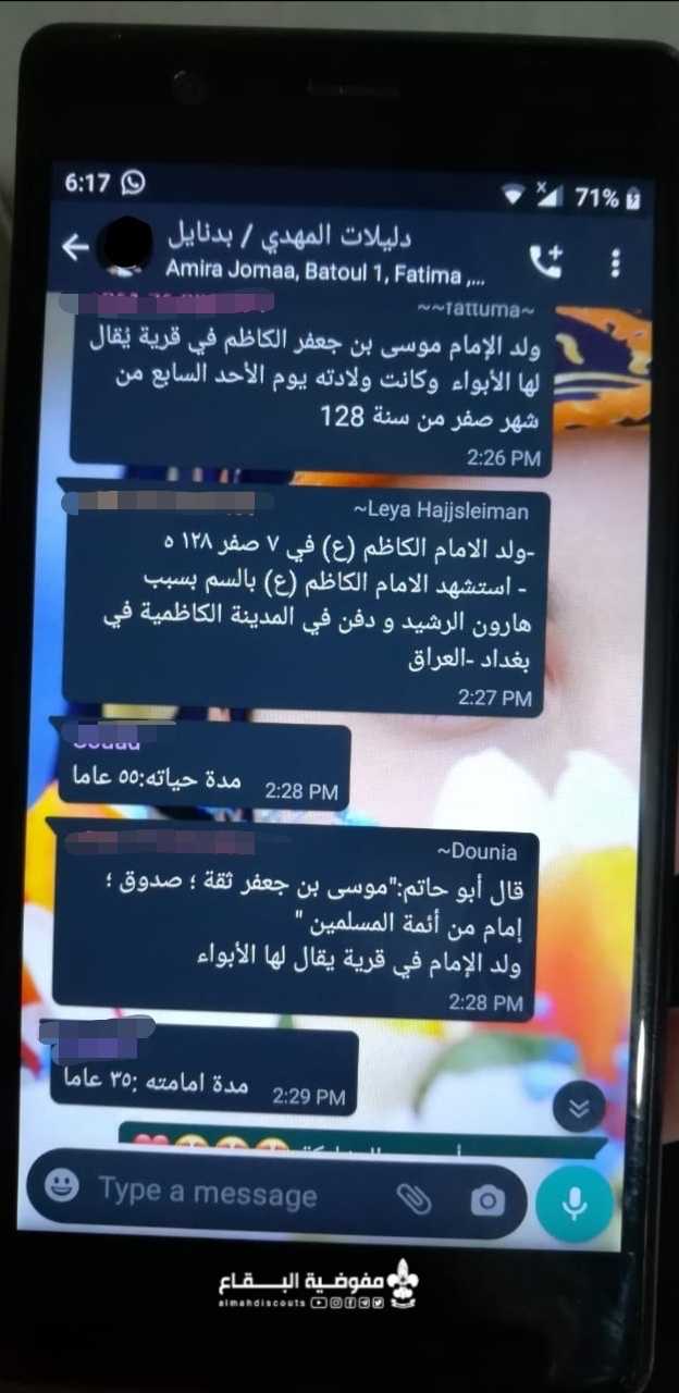 في أجواء شهادة الإمام الكاظم عليه السلام، شاركت ٢٠ كشفية من فوج السيدة نرجس/ بدنايل/ القطاع الاوسط بنشاط الكتروني حول المناسبة، حيث شاركن القائدة في تقديم معلومات عن الإمام وحياته المباركة...