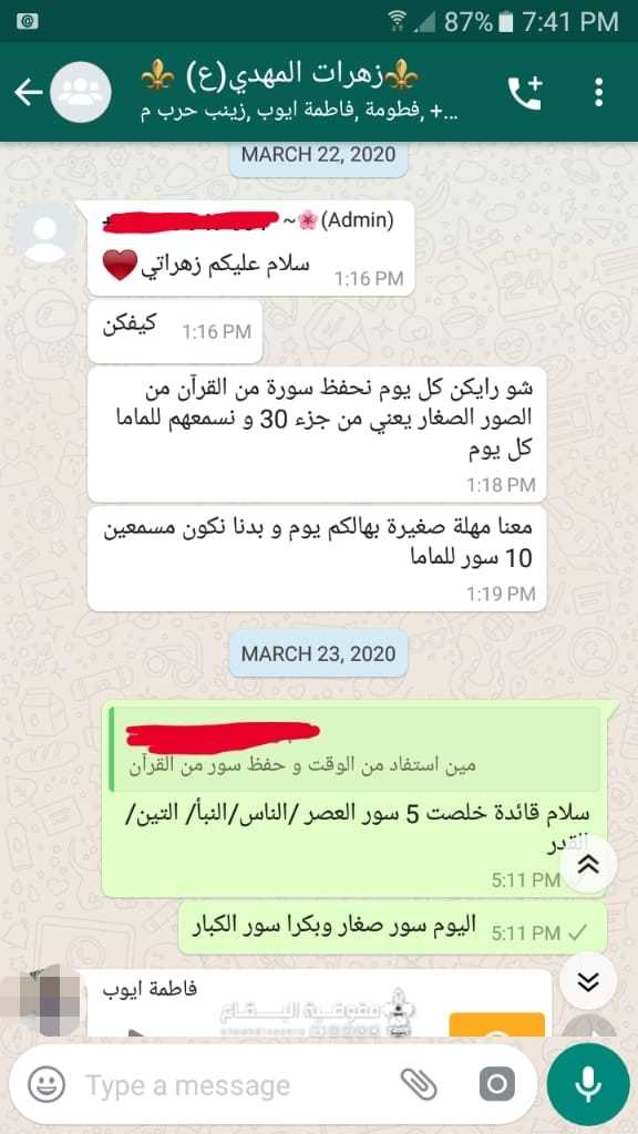 استكمالا لانشطة حفظ القرآن التي توقفت بسبب فايروس كورونا المستجد اطلق فوج السيدة مليكة حارة الفيكاني في القطاع الشرقي دورة الحفظ الاكترونية حيث تحفظ الكشفية السورة المطلوبة والتي تم شرحها وتصحيح قراءتها مع القائدة عبر الفيديو لتعود الزهرة وترسل فيديو يتم فيه تسميع ما حفظ