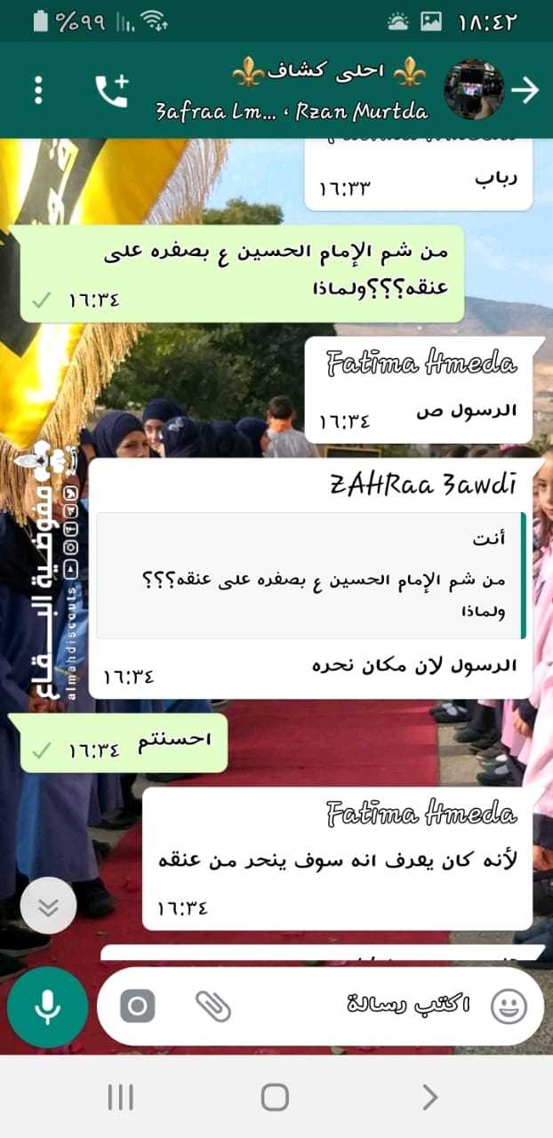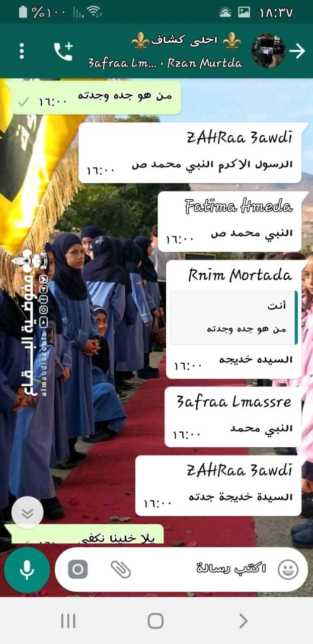 نفذ فوج السيدة خديجة/ قطاع الهرمل نشاطه الاسبوعي الالكتروني والذي تمحور حول ولادة الامام الحسين عليه السلام فكانت المناقشة الهادفة التي عرفت الكشفيات على المعلومات الشخصية للإمام عليه السلام