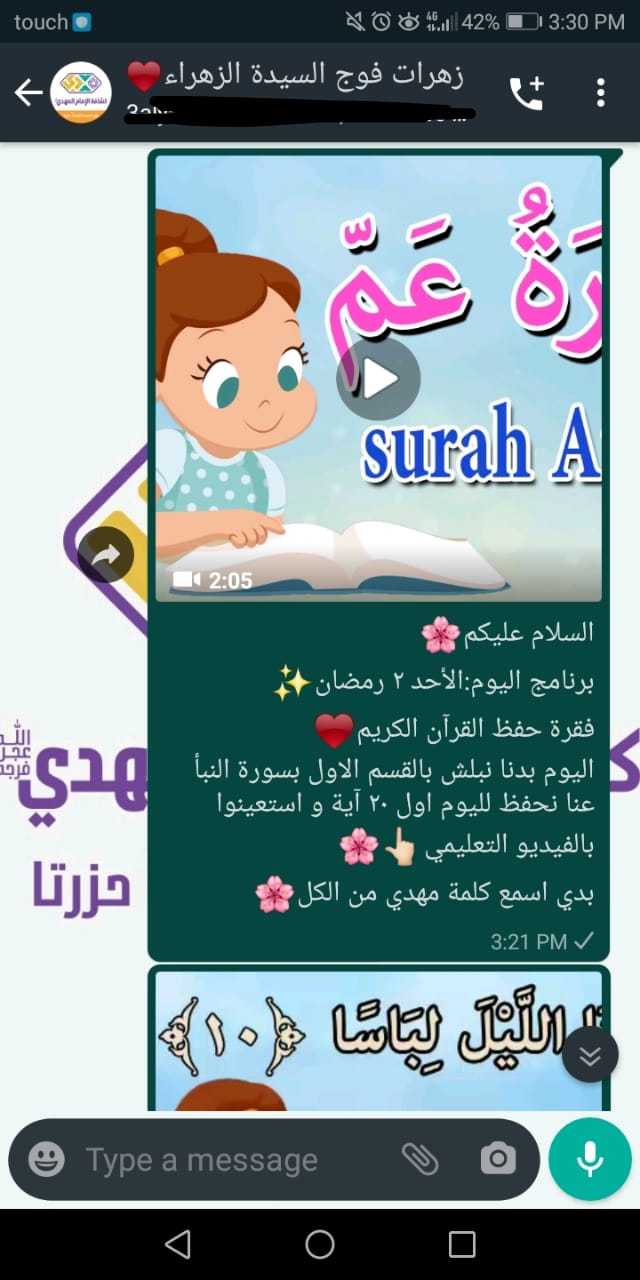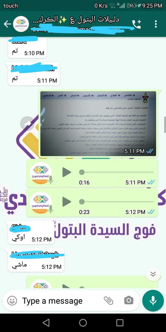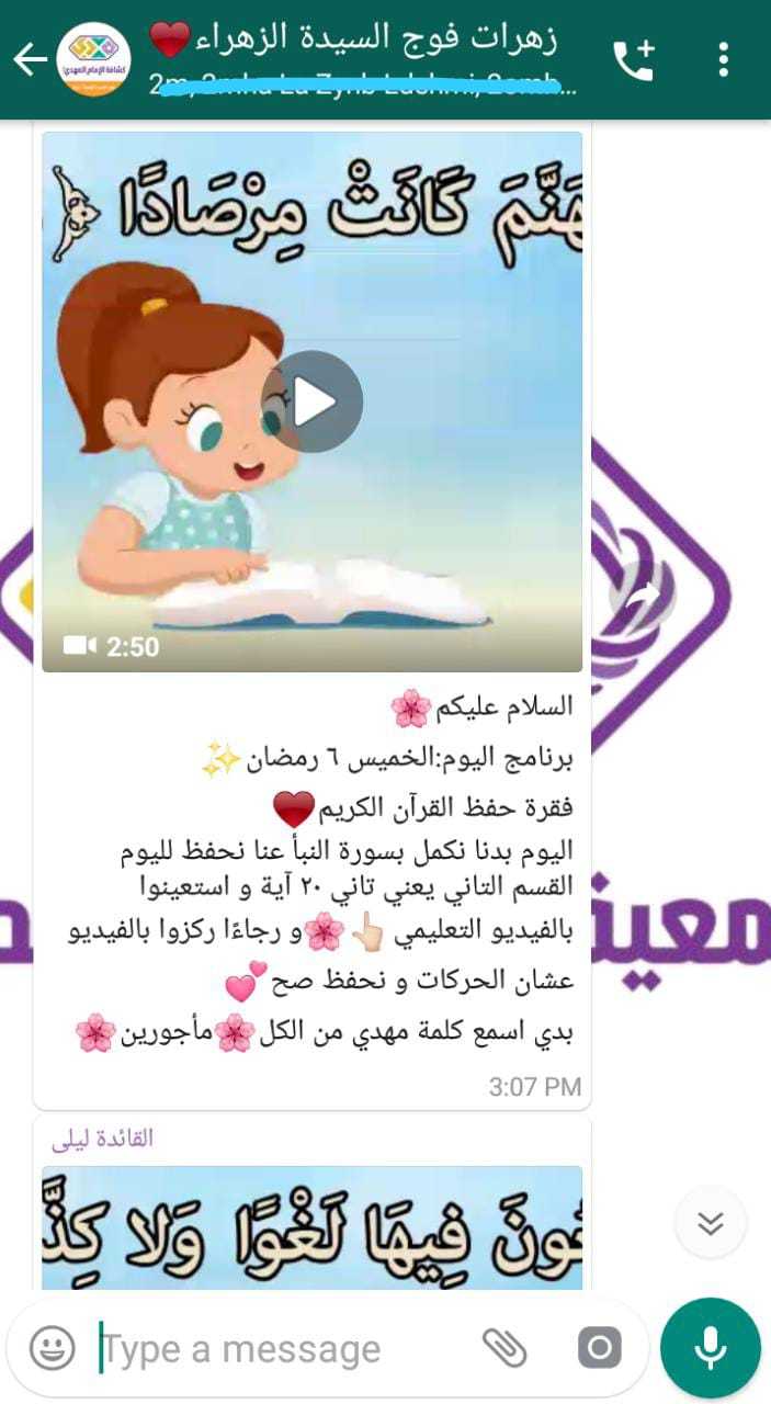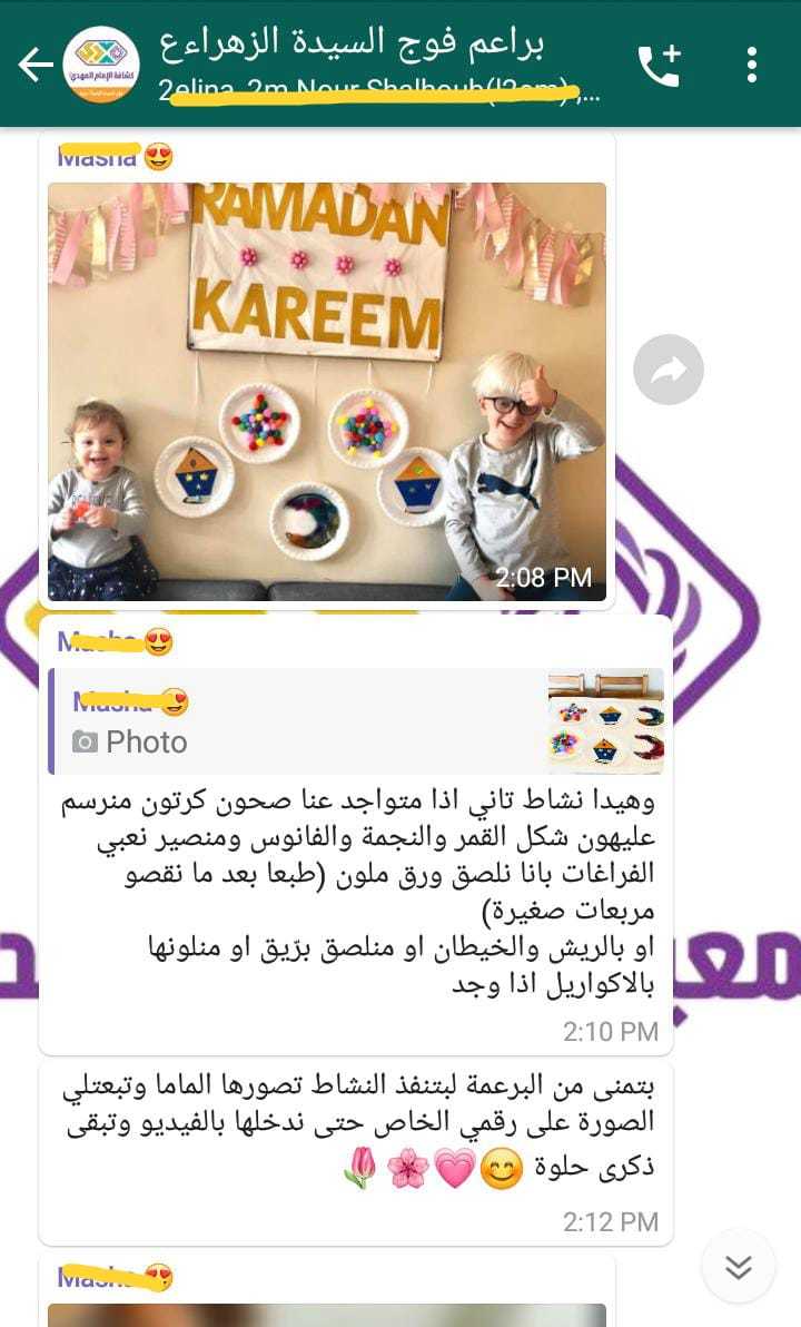 بعد الاستقبال المميز لافواج القطاع الأوسط لشهر رمضان المبارك انطلقن بالانشطة المميزة وعلى مدار 10 ايام كانت الورش الدينية، الثقافية والفنية في افواج، السيدة الزهراء/ حزرتا، السيدة البتول/ الكرك، السيدة حكيمة/ تعلبايا، السيدة خولة/ تمنين التحتا، السيدة خديجة/ حوش الرافقة وغيرها، بالاضافة الى المسابقات الالكترونية كما في فوج السيدة نرجس/ بدنايل، السيدة الزهراء/ حزرتا، ولا ننسى البرامج العبادية والقرآنية التي انطلقت في بعض الافواج الكترونيا أما فوج السيدة الحوراء/ تمنين الفوقا فقد قام بتنظيف وترتيب المسجد والمكتبة فيه ليكون كل ذلك بعين صاحب الزمان عليه السلام
