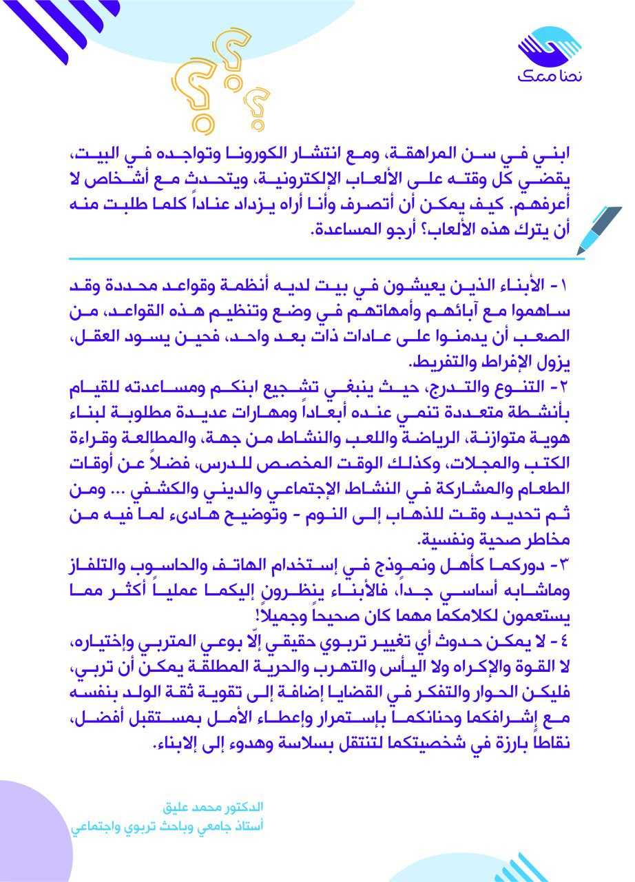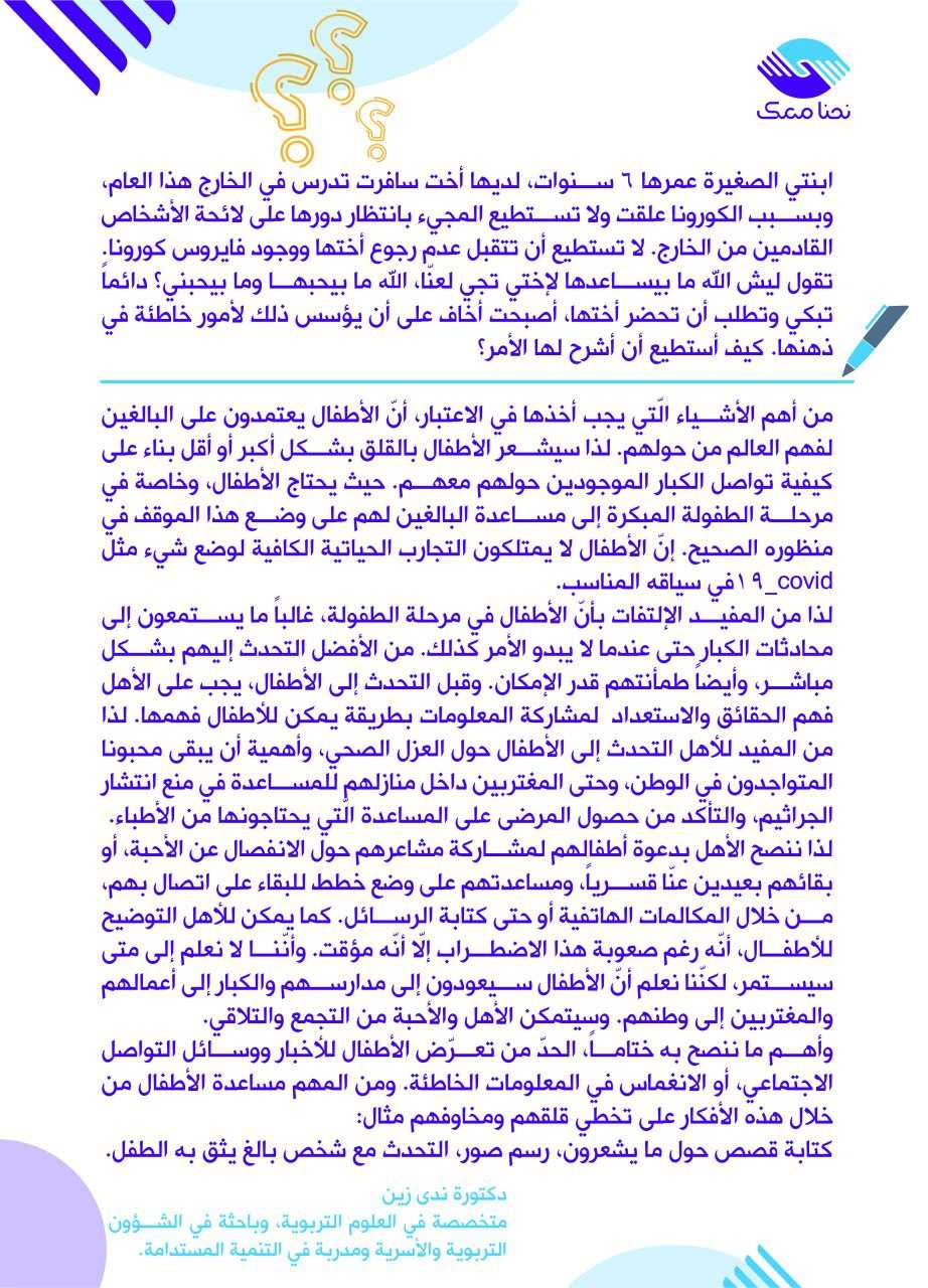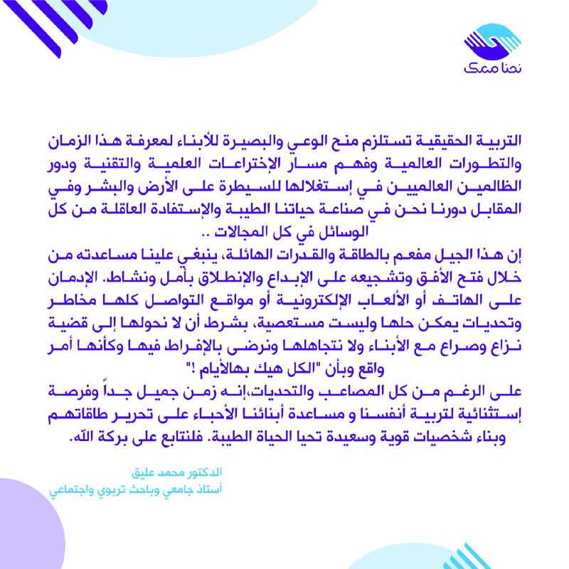 شعوراً منها بالمسؤولية تجاه أفراد المجتمع، أتت مبادرة مفوضية تنمية المجتمع في جمعية كشافة الإمام المهدي (عجّل الله فرجه) لتقول لكل أبٍ وأم "نحنا معك"، خاصةً في ظل الوضع الإستثنائي الذي فرضه فايروس كورونا على المجتمع، وما سببه للأهالي من ضغوطاتٍ إجتماعية ونفسية في متابعتهم لأمور أبنائهم وإدارة نشاطهم على مدار الوقت في المنزل، فضلاً عن الهواجس التربوية التي تشغل بالهم.