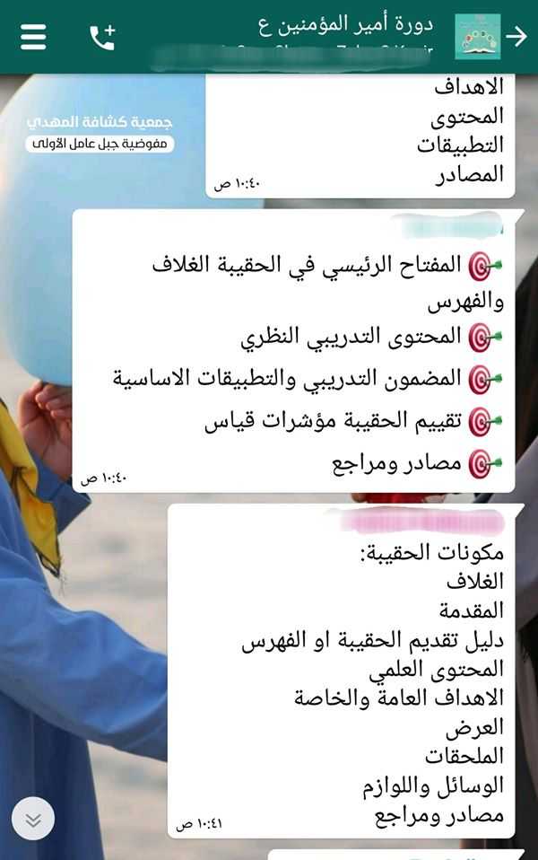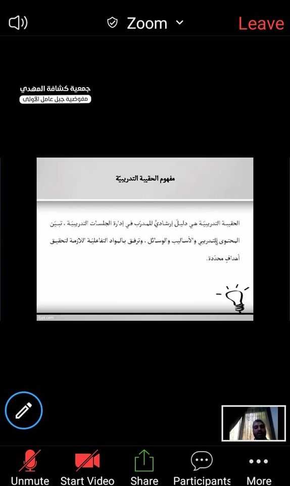 الدورة التي تعتبر من دورات التدريب المتقدم قدمت عبر تطبيقي" واتسآب" و "الزوم" وفي يومها الأول تعرفت المتدربات على الحقيبة التدربلية، مكوناتها، وخطوات اعداددها مع مفوض التدريب والبرامج في كشافة الإمام المهدي (عجل الله تعالى فرجه) الشيخ محمد السبلاني ضمن أجواء تفاعلية مميزة.