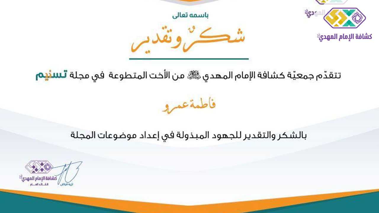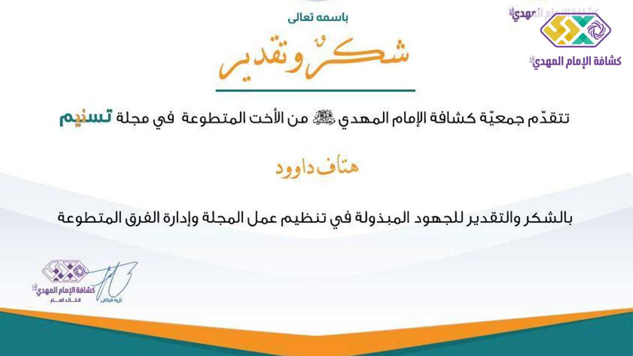 اختتم اللقاء بتوزيع تنويهات للأخوات العاملات المتطوعات في المجلة موقّعة من رئيس الجمعية الشيخ نزيه فياض.