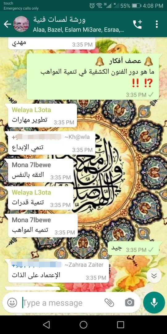 36 قائدة كشفية من القطاع الشمالي شاركن في ورشة لمسات فنية التي نفذتها أمانة الفنون في مفوضية مرشدات البقاع لهن عبر تطبيق الواتساب... تعرفت المشاركات من خلال الورشة على الفنون المعتمدة في الجمعية، بعض من اقوال الامام القائد عن الفن واهميته، كما وشرحن اهمية الفنون المعتمدة ودورها في تنمية مواهب الافراد...