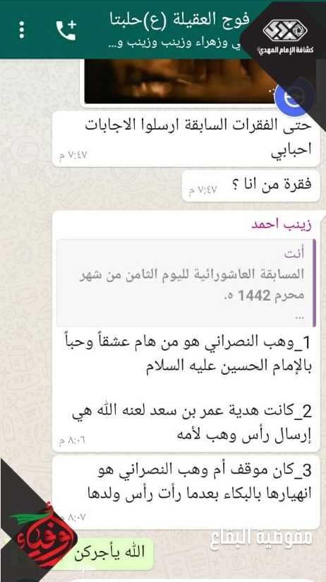 ولليوم السابع على التوالي تستمرت أفواج القطاع الشمالي بالأنشطة العاشورائية، فتنوعت على وسائل التواصل الاجتماعي الفقرات من قصص الى مسابقات فعبر وادعية ومجالس، بالاضافة الى الاحياءات التي نفذها الاطفال والناشئة في بيوتهم وشاركو القادة والقائدات وزملائهم بالصور، وقد تضمن الاحياء اضاءة الشموع وتقديم الضيافة على حب الحسين عليه السلام...