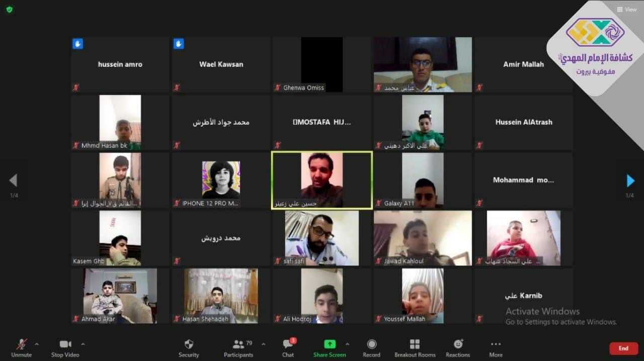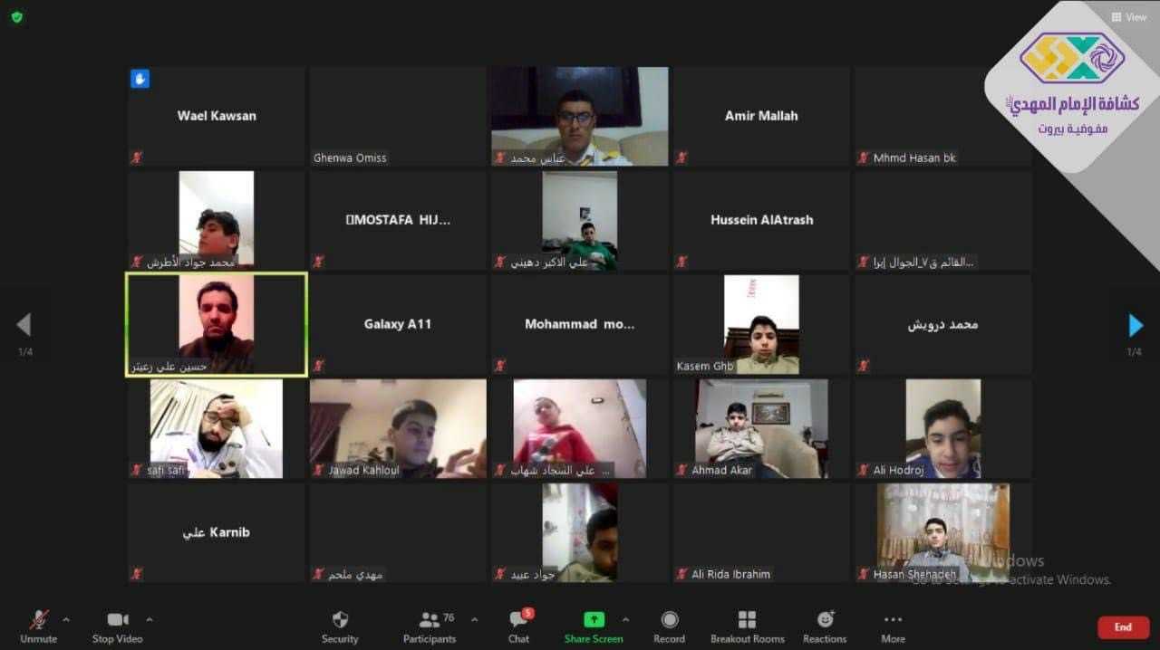 أقامت أمانة الفنون والمواهب في مفوضية بيروت لقاءً تأهيليّاً لفرق الانشاد في الافواج، شارك به ٨٧ كشفي وقائد، استهل اللقاء بالقران الكريم، وبعدها كلمة افتتاحية لامين الفنون والمواهب حيث أكد على أهمية استمرارية التدريب عن بُعد للفرق ومبادرة الكشفيين للتأهيل الذاتي والتعاون مع قائدهم بشكل دائم ومن ثم قدّم أمين الانشاد في الجمعية الاستاذ حسين زعيتر فقرات عملية وتدريبات وبرنامج لثلاثة اشهر المقبلة وتم عرض الوصلات الخاصة بولادة السيدة الزهراء (ع).