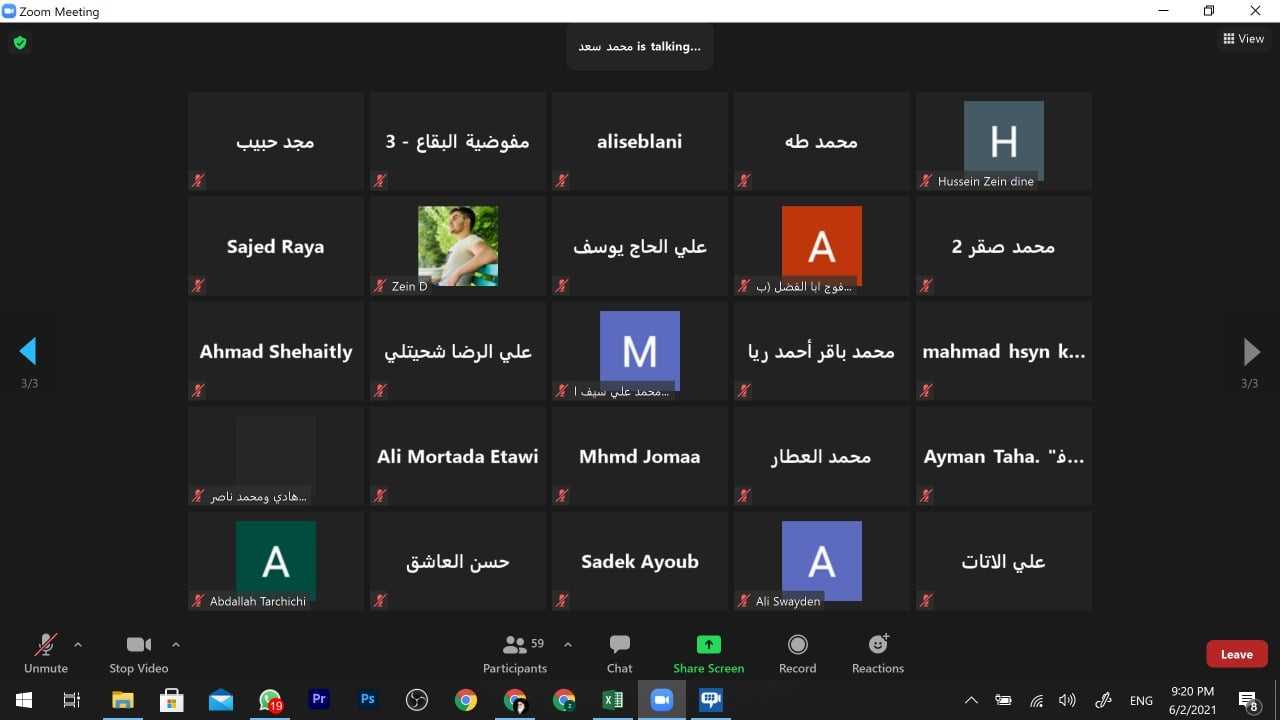 في وقت واحد وعلى شاشة واحدة اجتمع المتدربون أمام معاون مفوض العام الشيخ محمد سعد الذي رعى حفل الاختتام، وبعد تأدية مراسم الاحتفال تلاوة القرآن الكريم والنشيدين الرسميين الوطني اللبناني ونشيد الجمعية كانت كلمة راعي الحفل الذي أكد على هدفية مشاركة الشباب بتنشئة أفرادنا وموصياً اياهم ان يقدموا ما تعلموه لمن ينتظرهم وان يستمروا بذات الهمة والروحية.