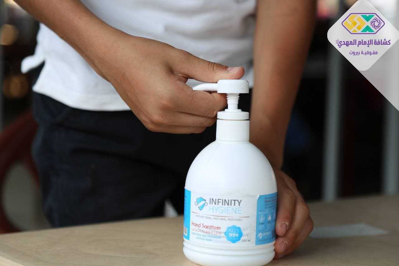 4- وضع معقم اليدين عند المداخل و مكاتب بيع البطاقات وبعض الاجنحة لتمكين المواطنين من تعقيم ايديهم بشكل متكرر .