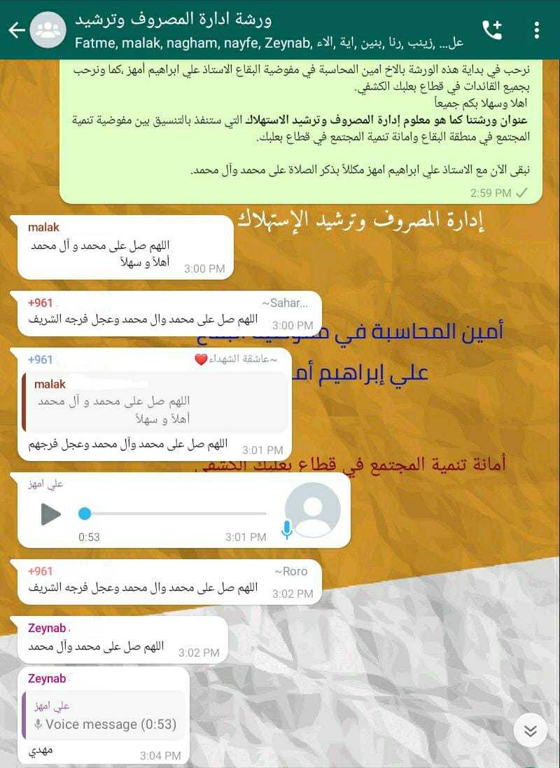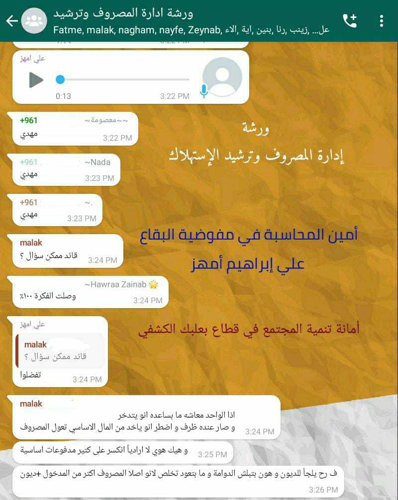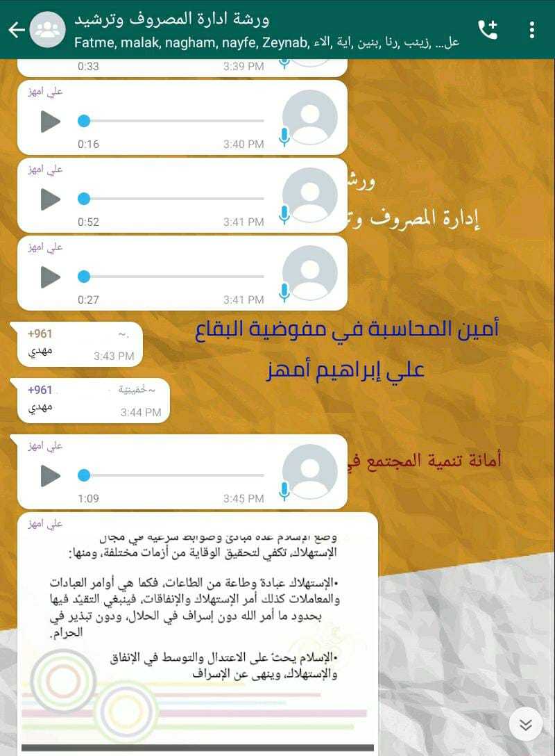 من هذا المنطلق نفّذت أمانة تنمية المجتمع في قطاع بعلبك ورشة "إدارة المصروف وترشيد الإستهلاك" مع أمين المحاسبة في مفوضية البقاع الأستاذ علي ابراهيم أمهز بمشاركة 39 قائدة عبر تطبيق الواتساب.