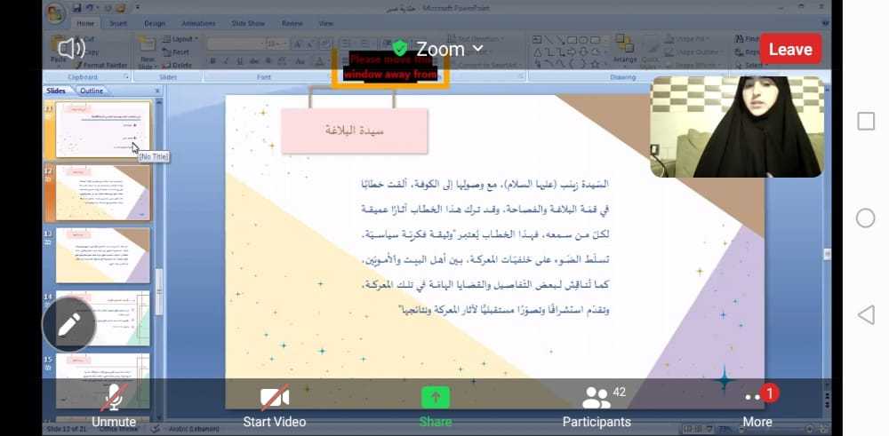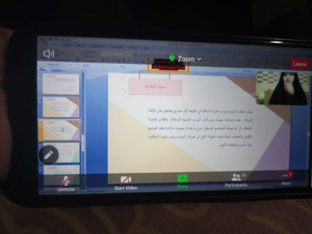 بمناسبة ولادة السيدة زينب عليها السلام أقام القطاع الشمالي ورشة \"حكاية صبر\" للدليلات والقائدات عبر تطبيق زووم بحضور مميز وتفاعل كبير وفي الختام تم سحب بالقرعة لمجموعة اسماء من الحاضرات حصلن على جوائز مالية