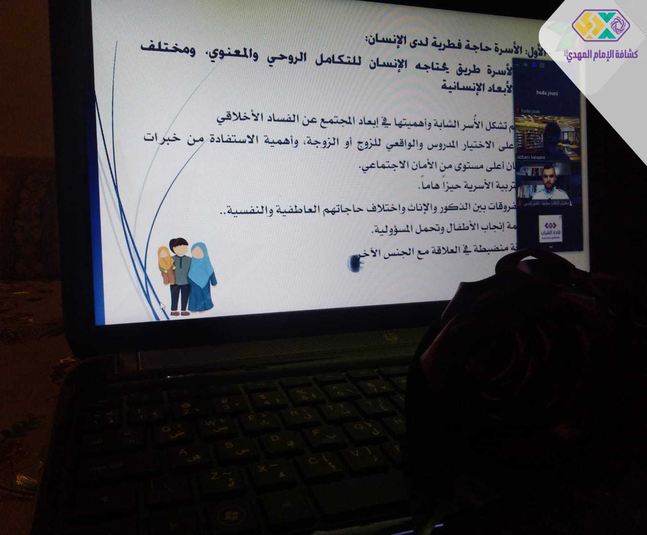 لمناسبة أسبوع الأسرة أقام منتدى مهدي الكشفي ندوةً حواريّةً حملت عنوان (نظام الأسرة في القرآن الكريم؛ منهاج حياةٍ طيّبة)، شارك فيها أكثر من 129 مشارك ومشاركة، قدّمها فضيلة الشيخ الدكتور عبّاس كنعان؛ استهلّت بتلاوة آياتٍ من القرآن الكريم، استفاض بعدها الدكتور في الحديث عن الزواج والأسرة في فكر الإمام القائد الخامنئي (دام ظلّه)، شارحًا مميّزات فكر الإمام في هذا المجال، ثمّ انتقل للحديث عن المنطلقات الأساسيّة للأسرة وفقًا للمنهج القرآني، والتحديّات التي تواجه الزواج والأسرة في عصرنا الراهن؛ اختتمت الندوة بمداخلاتٍ وأسئلةٍ من المشاركين أجاب عنها الدكتور.