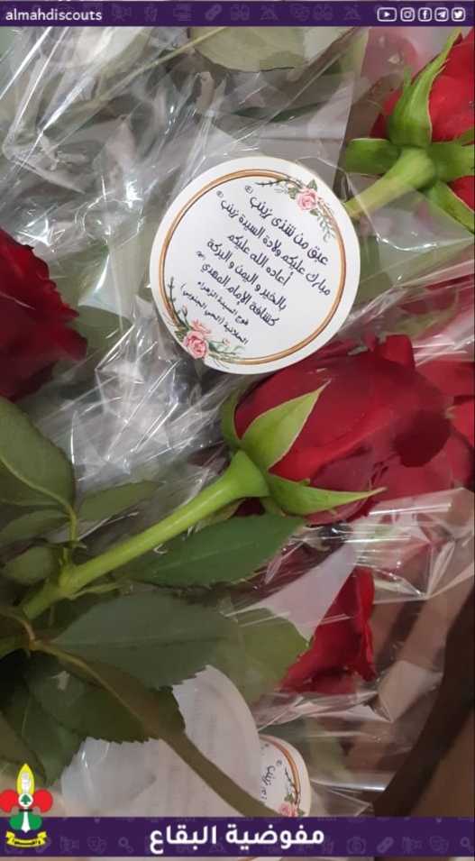 في أجواء ولادة السيدة زينب (ع) قامت قيادة ودليلات فوج السيدة الزهراء الحلانية /الحي الجنوبي في القطاع الشرقي بتوزيع الازهار على الممرضات في مستشفى تمنين ومستوصف الهيئة الصحية في علي النهري، متمنين لهن دوام النشاط والصحة كما وجلن على المنازل فوزعن الحلوى والهدايا على من كنيت باسم زينب